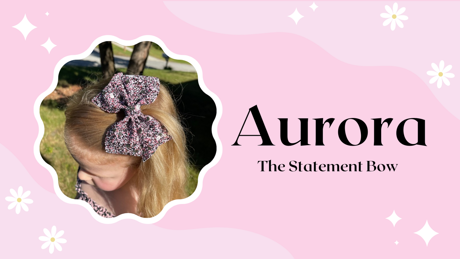 Aurora is our biggest bow and shaped like a pinwheel. She will make a great addition to little girls age 3 years and older or have thick/curly hair.