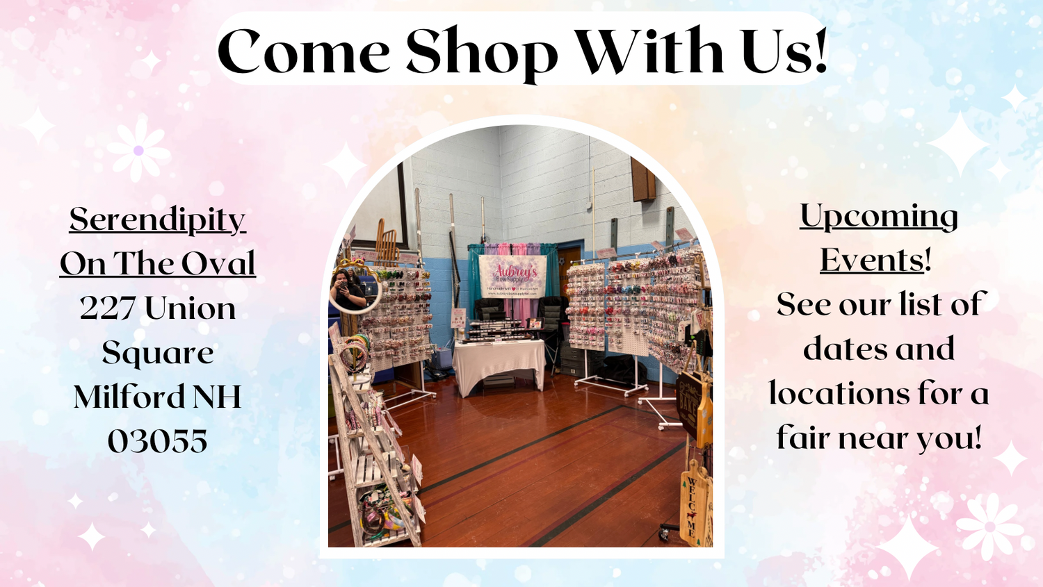 Here at Aubrey’s Bow Supply, every product is meticulously handcrafted with care in Hudson, NH. While we don't have a physical store, you can explore our full range of offerings right here on our website, as well as on our Facebook page and at Serendipity on the Oval. Catch us showcasing our products at various fairs and events - for updates on our schedule, remember to visit our main page regularly. Thank you for supporting our handmade creations!